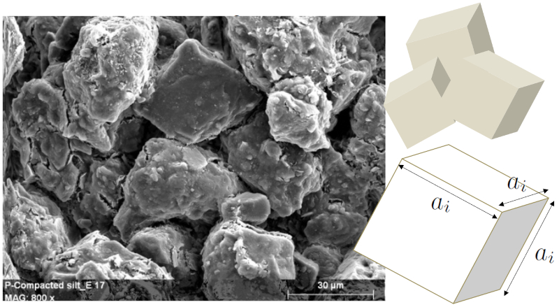 The model can be defined based on the existence of three types of materials (sand, silt, and clay), with grains modeled as follows: in the first two cases, the grains are represented as spheres with different average radii, and in the case of clay, the grains are modeled as straight parallelepipeds.