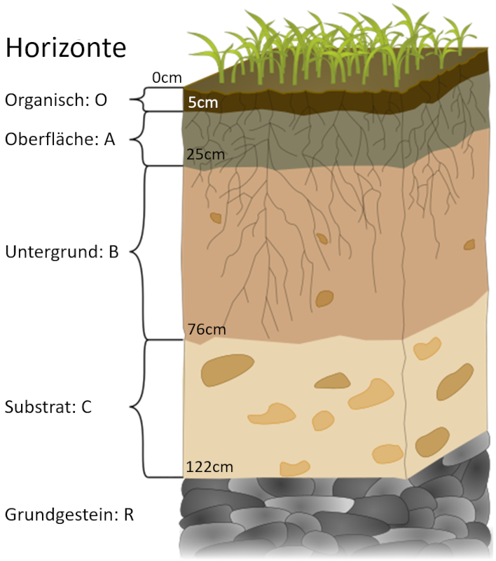 O: Organische OberflächenschichtDiese Schicht entsteht durch die Anhäufung von organischem Material, das hauptsächlich aus sich zersetzendem Pflanzenmaterial und Humus besteht. Die Menge an organischem Material kann je nach Art der Vegetation und ihrem Entwicklungsstadium bis zu 100% erreichen.A: OberbodenDer A-Horizont entsteht durch eine Kombination aus mineralischer Erosion, der Zugabe von organischem Material aus dem oberen Horizont und den Aktivitäten von Bodenorganismen. Der Großteil dieser Schicht besteht aus den mineralischen Bestandteilen des Bodens, wobei der organische Anteil bis zu 10% betragen kann.B: UnterbodenDer B-Horizont akkumuliert Mineralien und aus dem A-Horizont nach unten bewegte lixivierte Materialien. Diese Anreicherung kann auch durch Mineralien erfolgen, die aus anderen Gebieten transportiert werden, und durch chemische Prozesse innerhalb des Horizonts. In dieser Schicht bestehen die meisten Bestandteile aus Bodenmineralien, wobei der organische Anteil bis zu 5% betragen kann.C: SubstratDer C-Horizont entsteht hauptsächlich durch geologische Prozesse und trägt zur allgemeinen Geländeform bei. Er stellt Materialien bereit, die mit den oberen Schichten interagieren. In dieser Schicht bestehen die meisten Bestandteile aus Bodenmineralien, wobei der organische Anteil bis zu 1% betragen kann.Die Dicke der ersten beiden Schichten kann von wenigen Zentimetern bis zu mehreren Dezimetern variieren, während die letzten Schichten von Dezimetern bis zu Metern reichen können. Es ist wichtig zu beachten, dass die in der Wikipedia-Abbildung angegebenen Dickenwerte nur als illustrierende Beispiele dienen und in der Realität erheblich variieren können.