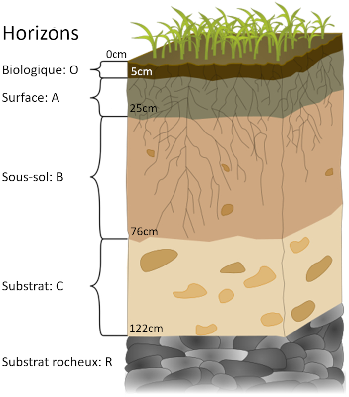 Les sols présentent une structure de base composée de différentes couches, dont la formation résulte de leur formation initiale et de leur évolution, sous l'influence de facteurs tels que l'érosion et la croissance de la végétation. Bien que l'épaisseur de ces couches puisse varier considérablement, elles présentent des modèles clairs en ce qui concerne leur teneur en matière organique :