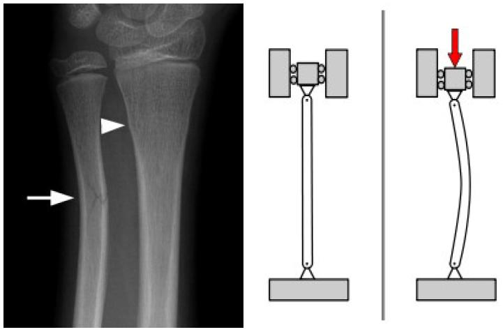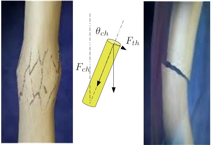 Se consideran dos situaciones, la caída (quiebre por pandeo, compresión o flexión) e impacto en la parte central del hueso (quiebre por flexión).