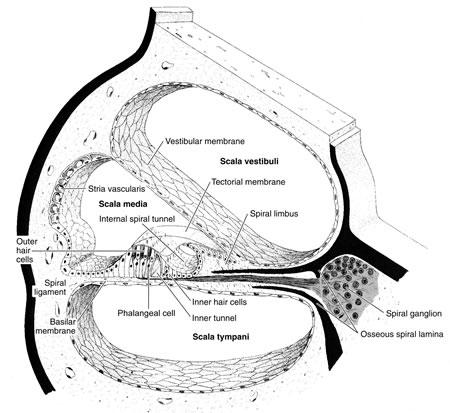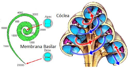 La cóclea tiene la forma de un caracol que se vuelve cada vez mas estrecho. Consta de dos cámaras separadas por una membrana que se extienden por todo el largo de la cóclea. El sonido penetra por el canal y la membrana entra en resonancia en una profundidad que depende del largo de onda. De esta forma se desglosa la señal en sus componentes según la frecuencia.