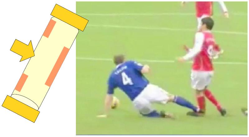 Si un jugador recibe un impacto en la mitad del hueso y se considera que el pie, debido a la fricción, y el cuerpo, debido a la inercia, son puntos fijos, se genera una carga que flexiona el hueso.