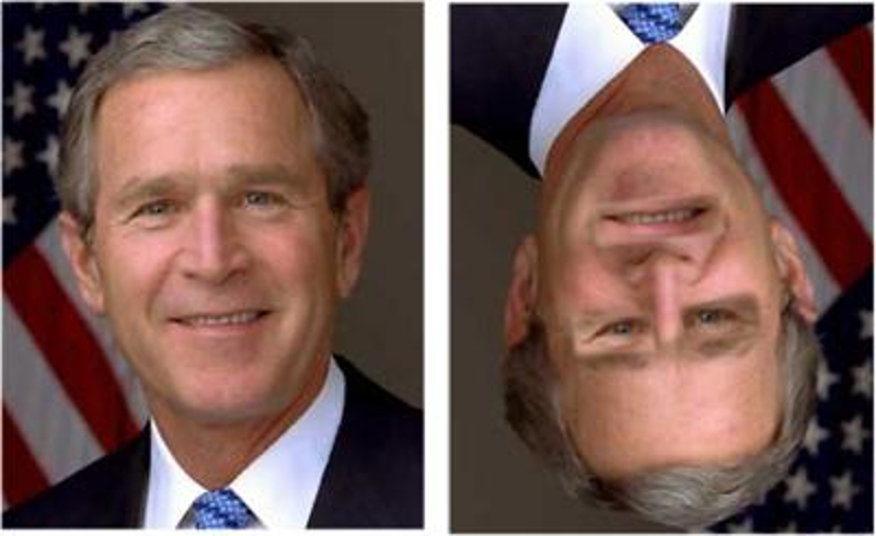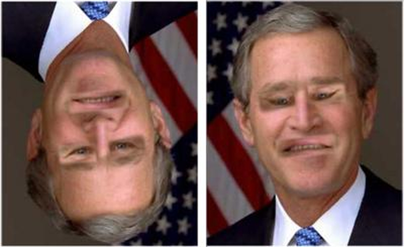 Invirtiendo la Imagen se logra 'percibir' lo que antes estaba oculto a plena vista. Nuestro cerebro 've por partes' o sea ve a una cara invertida y dos ojos y boca que parec an sonre r. Cada elemento por si da sentido solo que la cara estaba invertida y ojos y boca no. Una vez invertida la imagen se logran percibir los elementos en un conjunto: