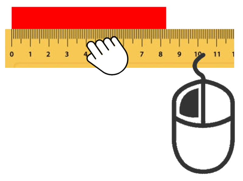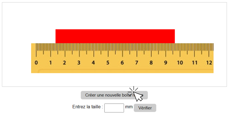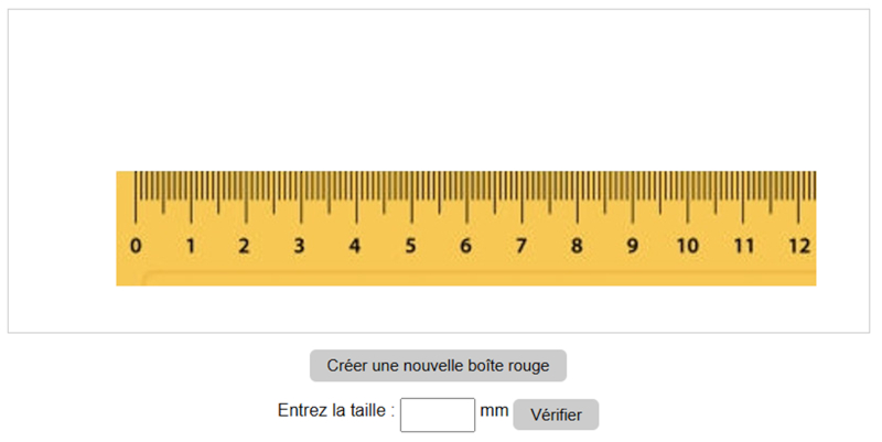 Créez une boîte rouge en cliquant sur le bouton situé sous la règle. Ensuite, faites-la glisser en maintenant le bouton gauche de la souris enfoncé jusqu'à aligner le zéro avec le bord gauche de la boîte. Lisez la valeur au niveau du bord droit, saisissez-la dans le champ ci-dessous, puis cliquez sur le bouton pour vérifier si la mesure est correcte.Considérez le panneau du simulateur :