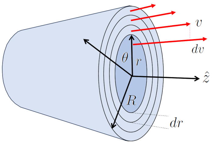 El flujo laminar alrededor de un cilindro se puede representar como múltiples capas cilíndricas que se deslizan bajo la influencia de las capas adyacentes. En ese caso, la fuerza viscosa ($F_v$) con el largo de tubo ($\Delta L$), la viscosidad ($\eta$), y las variables la posición radial en cilindro ($r$) y la velocidad en un radio del cilindro ($v$) se expresa como: