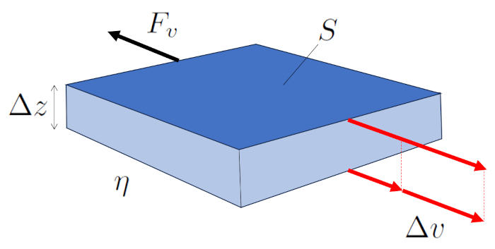 Por lo tanto, la fuerza la fuerza viscosa ($F_v$) generada por unas superficies paralelas ($S$) sobre la otra es una funci n de una diferencia de velocidad entre superficies ($\Delta v$), una distancia entre las superficies ($\Delta z$) y una viscosidad ($\eta$), como se muestra en la siguiente ecuaci n: