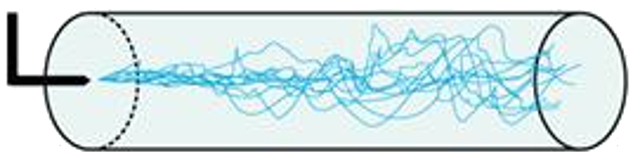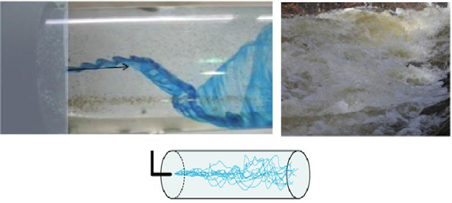 No laboratório, é injetada tinta azul que se desvia significativamente de um fluxo linear, revelando assim a presença de vórtices e um grau de difusão devido a perturbações de menor amplitude.