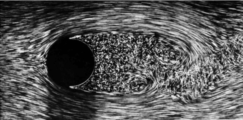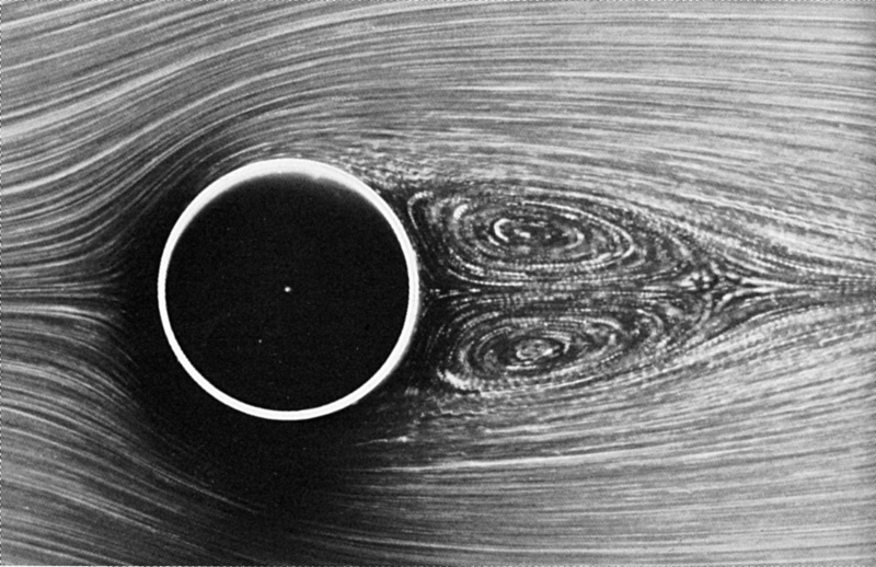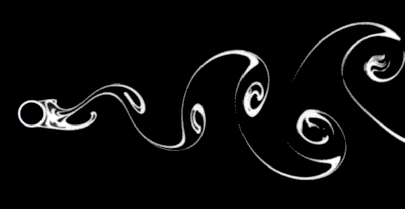 Quando o número de Reynolds está entre 40 e 150, o fluxo apresenta a formação de vórtices alternados, criando o que é conhecido como uma rua de vórtices de Karman:
