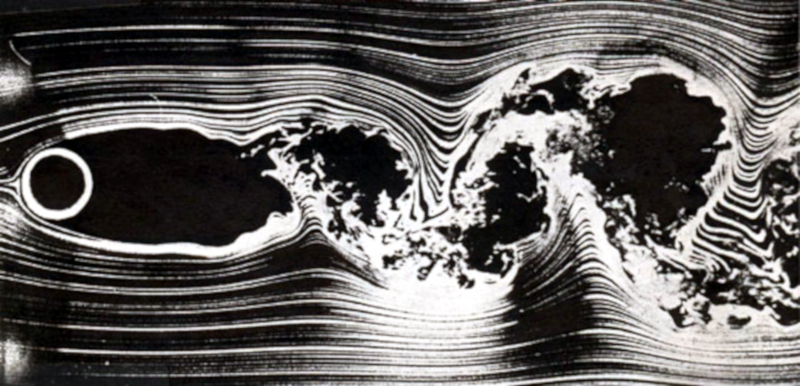 Quando o número de Reynolds está entre 150 e 3E+5, o fluxo apresenta um nível significativo de caos dentro de uma estrutura macroscópica: