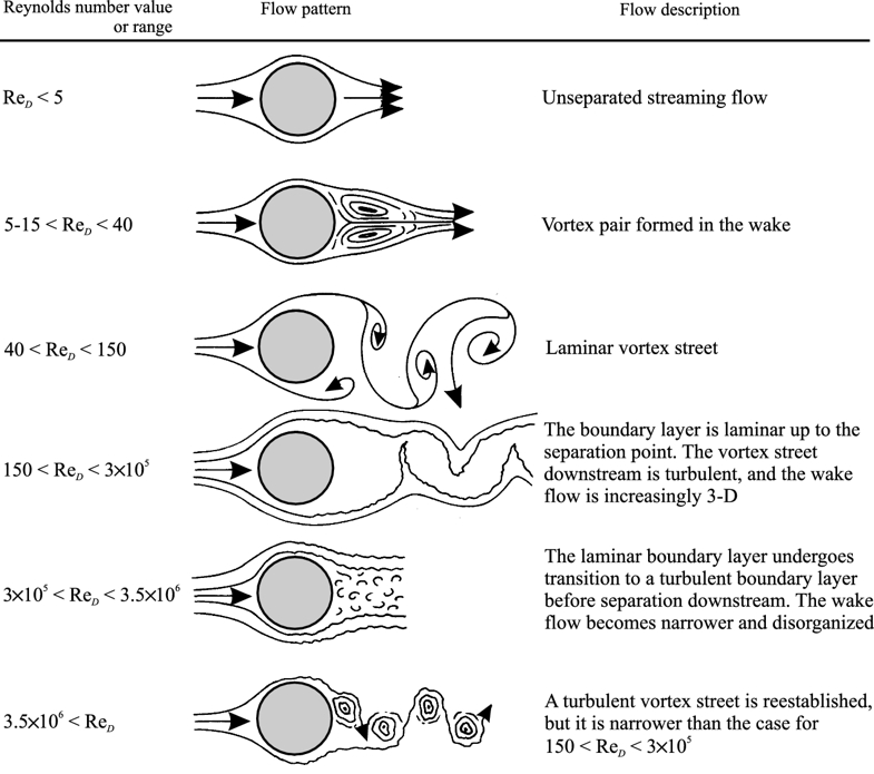 O comportamento do fluxo ao redor de uma esfera exibe mudanças dramáticas com base no número de Reynolds calculado em relação ao raio da esfera. O seguinte diagrama fornece um resumo conciso dos diferentes comportamentos: