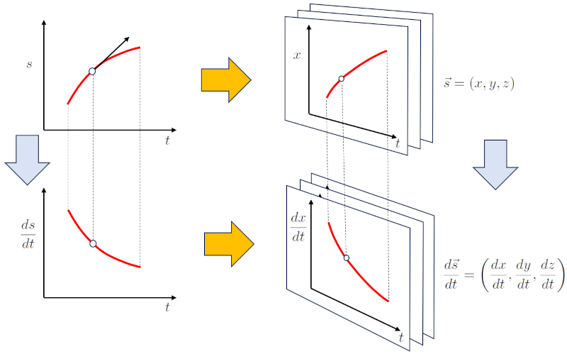 $v=\displaystyle\frac{ds}{dt} \rightarrow \displaystyle\frac{d\vec{s}}{dt} = \left(\displaystyle\frac{dx}{dt}, \displaystyle\frac{dy}{dt}, \displaystyle\frac{dz}{dt}\right) = (v_x, v_y, v_z) = \vec{v}$