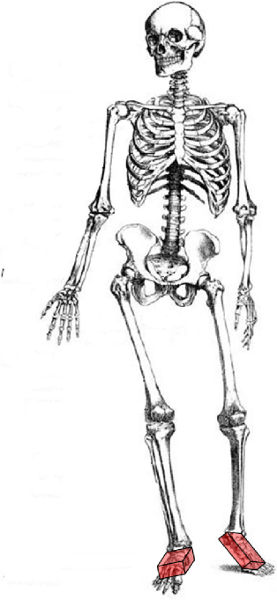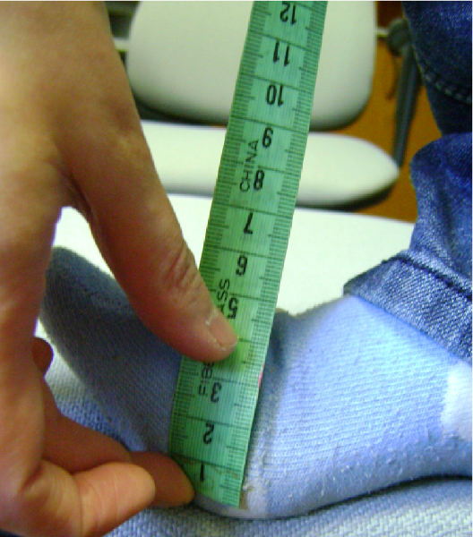 La distancia talón-tobillo se mide a la altura mas prominente del talon y se proyecta horizontal hasta la altura del tobillo: