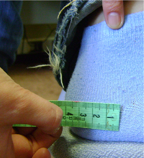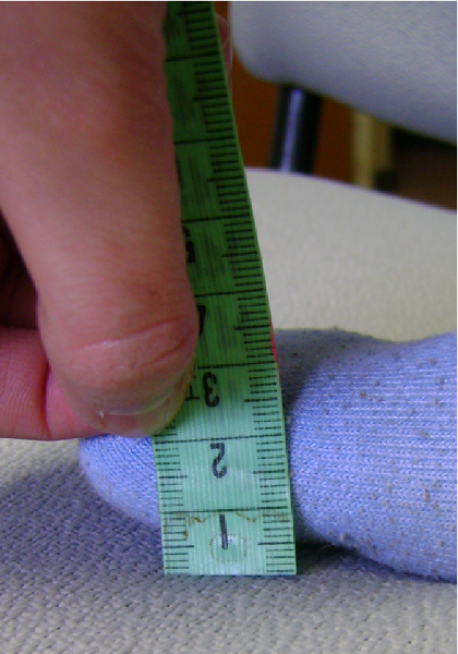 Nota: la idea es no curvar la huincha si no que mantenerla horizontal y estimar a que altura (en la proyección) se encuentra el punto mas ancho del pie.