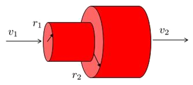 Wenn wir annehmen, dass die Fl ssigkeit inkompressibel ist, das hei t, sie kann nicht komprimiert werden, wird ihr Volumen immer gleich bleiben. In diesem Fall besagt die Kontinuit t, dass das Volumen, das in ein Rohr eintritt, dem Volumen entsprechen muss, das es verl sst. Das bedeutet, dass die anf ngliche Flussrate, gekennzeichnet als $J_1$, und die endg ltige Flussrate, gekennzeichnet als $J_2$, gleich sein m ssen.