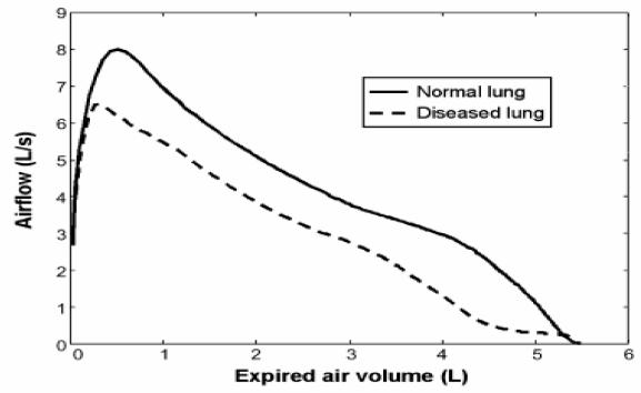 Si se gr fica la relaci n flujo vs volumen exhalado para el caso de un pulm n normal o otro con alguna deficiencia se obtiene la curva indicada: