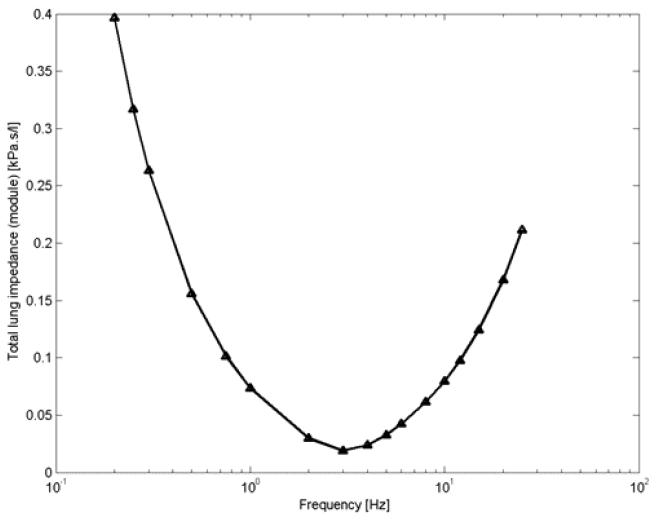 Diagrama de la oscilación de un modelo dinámico para un pulmón bajo respiración forzada (caso de un adulto). En el se representa la impedancia, que corresponde a una medida de la resistencia, en función de la frecuencia de respiración: