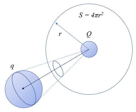 Andererseits werden diese Boten in alle Richtungen ausgesendet und verteilen sich ber eine imagin re Kugel, die die Ladung umgibt. Die Oberfl che dieser Kugel betr gt $4\pi r^2$, wobei
