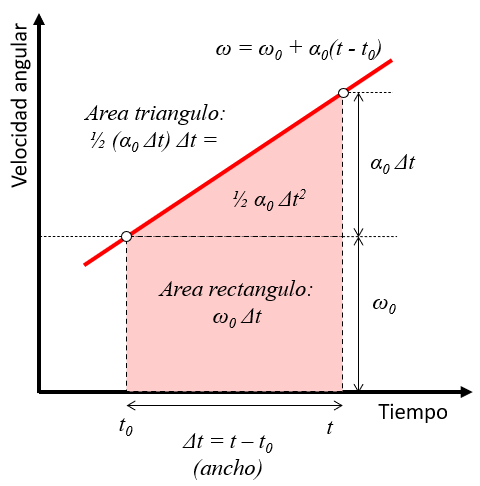 Dado que o deslocamento total corresponde rea sob a curva de velocidade angular versus tempo, no caso de uma aceleração angular constante ($\alpha_0$), determina-se que o deslocamento o ângulo ($\theta$) com as vari veis o ângulo inicial ($\theta_0$), o tempo ($t$), o tempo inicial ($t_0$) e la velocidade angular inicial ($\omega_0$) o seguinte: