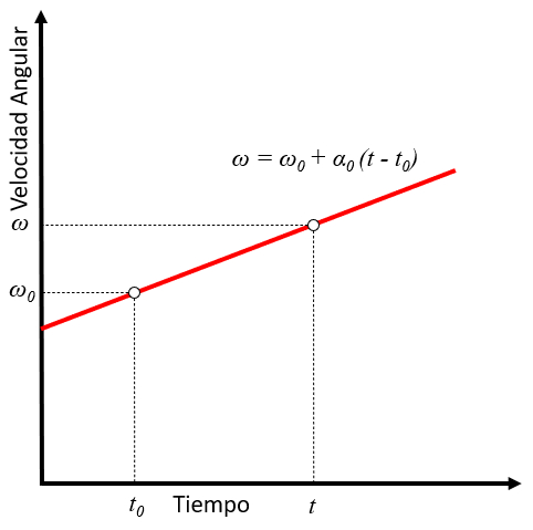 No caso de la aceleração angular constante ($\alpha_0$), la velocidade angular ($\omega$) como fun o de o tempo ($t$) segue uma rela o linear com o tempo inicial ($t_0$) e la velocidade angular inicial ($\omega_0$) na forma: