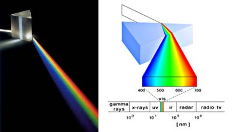 Como el ángulo de refracción depende de la frecuencia o longitud de onda de la luz en el vidrio, se puede usar un prisma para descomponer la luz en sus diferentes colores.