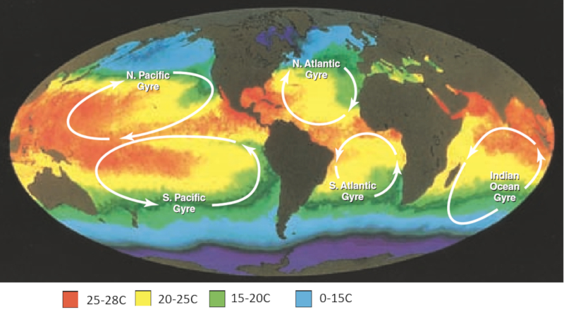 Windinduzierte Zirkulation b> in der Atmosph re erzeugt f nf Hauptwirbel: zwei im Pazifik, zwei im Atlantik und einen im Indischen Meer.
