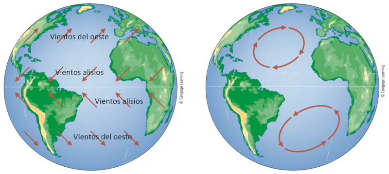 Las corrientes marinas son ageneradas por los vientos de superficie y fluctuaciones de la densidad del agua. El sentido de la circulaci n es definido por los vientos del oeste (westerlies) y vientos alisios (trade winds), generando circulaciones negativas en el hemisferio norte y positivas en el hemisferio sur.