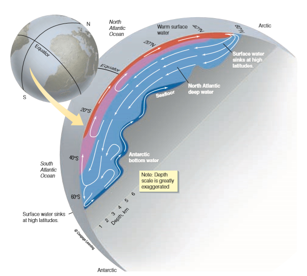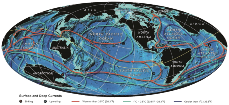 La densidad del agua (efecto de salinidad) genera una parte del flujo se 'hunda' participando en lo que son las corrientes de profundad o 'afloren' y participen en las de superficie.
