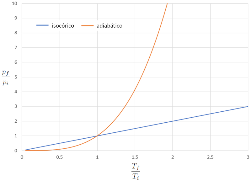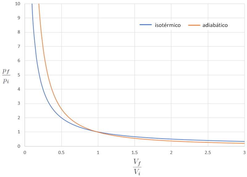 Em outras palavras, em um processo de compressão, se o processo for isotérmico, a resposta é mais suave em comparação com o caso adiabático, pois a pressão aumenta mais lentamente. Em um processo de expansão, o comportamento do gás em modo adiabático é mais suave.