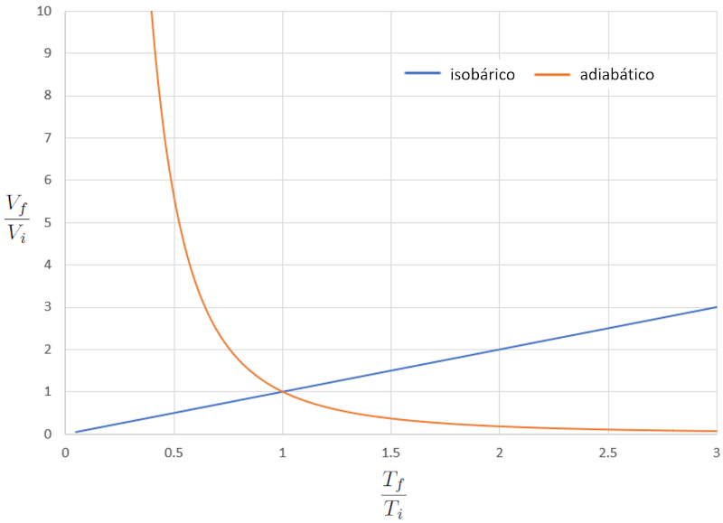 Com os valores o volume no estado i ($V_i$), o volume no estado f ($V_f$), la temperatura no estado inicial ($T_i$), la temperatura no estado final ($T_f$) e o índice adiabático ($\kappa$), apresenta-se a seguinte relação: