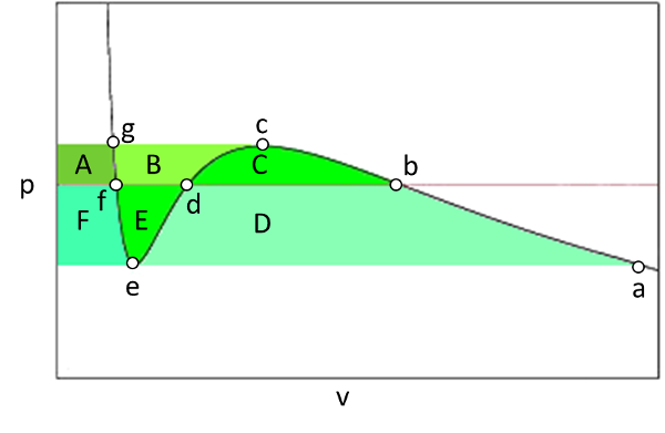 lo que lleva a que las áreas C y E deben ser iguales. Como el sistema en equilibro siempre tendrá una energía libre de Gibbs mínima, se concluye que el sistema tiene que permanecer en el punto de intersección o sea pasa directamente del punto b al punto f o viceversa.