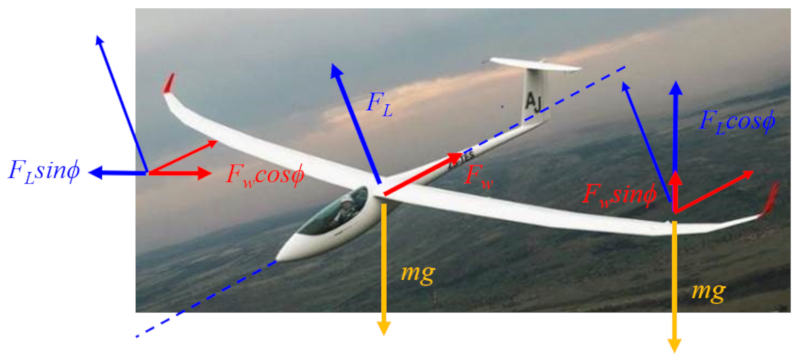 Die Auftriebskraft ($F_L$) ist mit die Körpermasse ($m$), die Gravitationsbeschleunigung ($g$) und der Gleitwinkel ($\phi$) gleich: