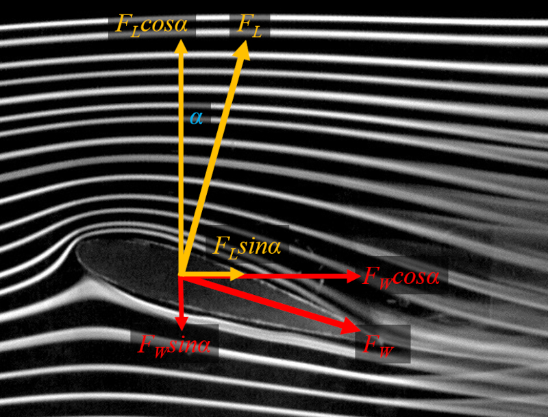 Die Gesamtwiderstandskraft setzt sich aus den horizontalen Komponenten der Widerstandskraft des Profils des Fl gels $F_W$ und der Auftriebskraft $F_L$ zusammen, die aus dem Anstellwinkel $\alpha$ berechnet werden k nnen:
