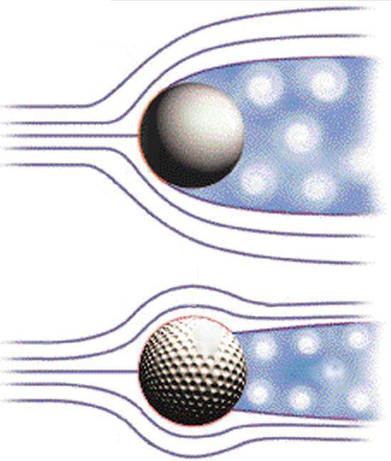Wenn das Ziel darin besteht, den Widerstand eines Balls zu verringern, ist es notwendig, die Reynolds-Zahl zu erh hen, um von der Verringerung des Widerstandsbeiwerts zu profitieren. Dies kann durch Einf hrung von Rillen, wie sie bei einem Golfball vorhanden sind, erreicht werden. Diese Rillen wirken wie kleine Trennelemente, die die Luftschicht am Ball halten und den Fluss l nger linear halten, wodurch der Bereich, der den Widerstand erzeugt, verringert wird.
