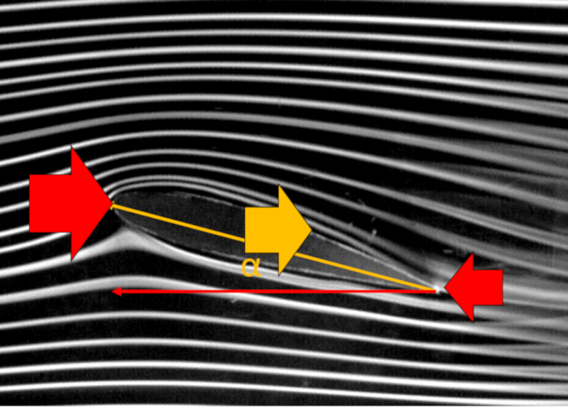 Die Summe aller Drücke auf der Oberfläche in Flugrichtung, sowohl vor dem Flügel (Rückwärtskraft) als auch hinter dem Flügel (Vorwärtskraft), führt zu einer Gesamtkraft, die wir Widerstand nennen. Um einen Körper (Flugzeug / Vogel) antreiben zu können, muss der Vortrieb diese Widerstandskraft übertreffen.