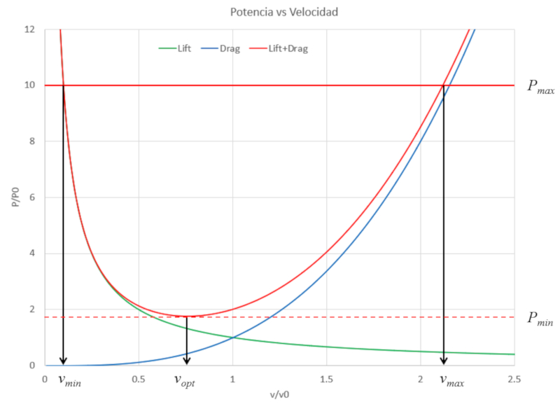 Le diagramme suivant montre les deux composantes de la puissance totale de vol. La première correspond à la résistance élevée rencontrée à basse vitesse en raison de l\'angle d\'attaque nécessaire pour générer une portance suffisante. La deuxième composante illustre comment la puissance requise pour le vol augmente de manière assez dramatique à des vitesses plus élevées :