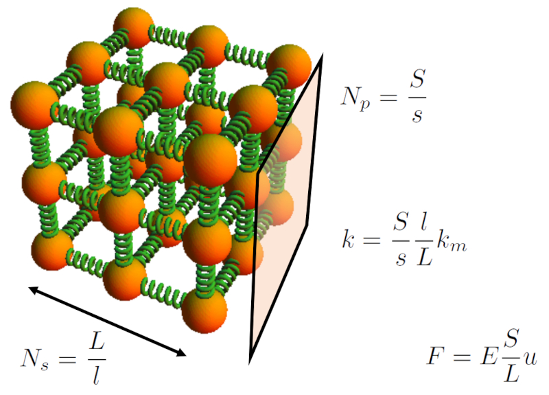 O s lido modelado como uma rede de molas cuja quantidade estimada com base em o comprimento do corpo ($L$) e la seção de elemento ($S$) em rela o a o comprimento microscópico da mola ($l$) e la seção microscópica da mola ($s$).