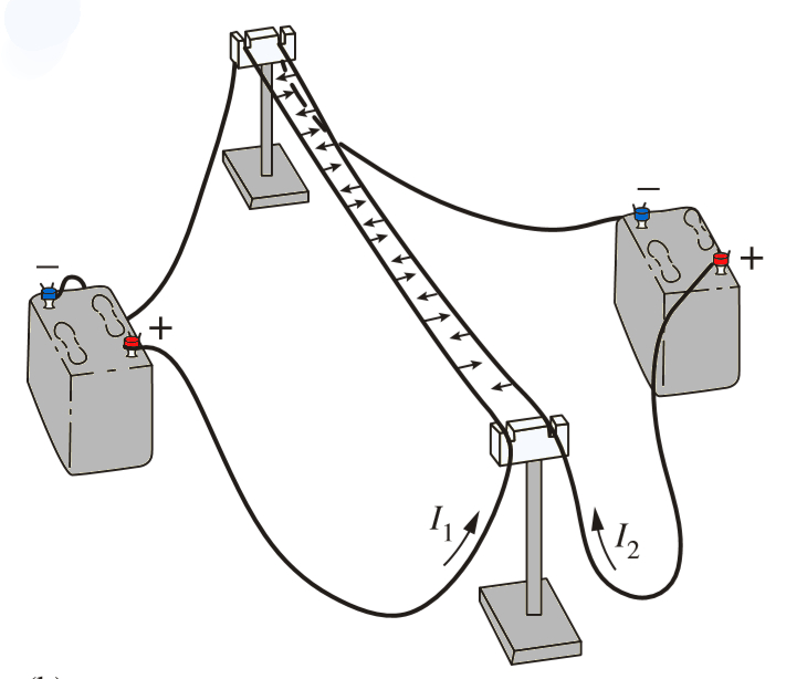 Lorsque deux courants circulent de mani re parall le mais en sens oppos , on observe une force r pulsive entre les fils.