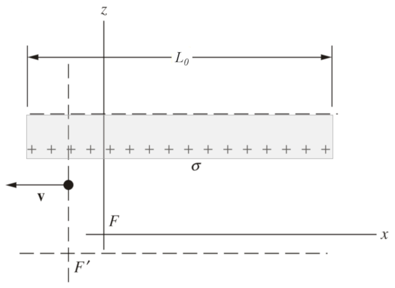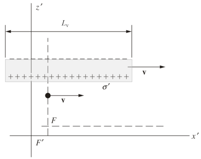 Wenn sich die Platten bewegen, wird ihre horizontale L nge aufgrund der relativistischen Effekte verk rzt. Obwohl die Ladungen von der Bewegung nicht beeinflusst werden, wird die Ladungskonzentration pro Fl cheneinheit aufgrund der Kontraktion der Platten erh ht. Diese Zunahme der Ladungskonzentration pro Fl che f hrt zu einer Zunahme des elektrischen Feldes zwischen den Platten:
