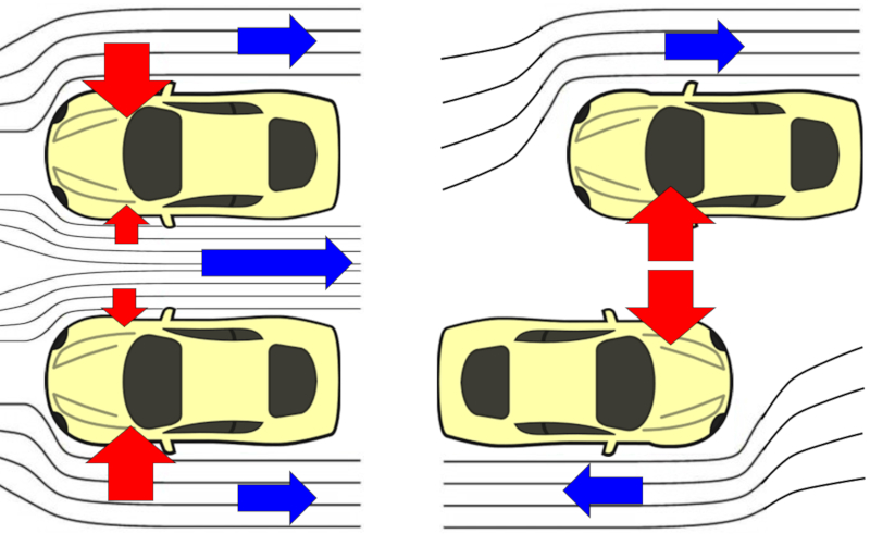 Por lo tanto, se observa que si hay un gradiente en la velocidad, este es inverso al de la presión. Si uno aumenta, el otro disminuye, lo que explica que al rebasar los autos presenten una mayor velocidad entre ellos, lo que lleva a una reducción de la presión entre ambos, succionándolos mutuamente. A la inversa, si se cruzan, la velocidad entre ambos es aproximadamente nula, lo que genera un gradiente de presión que los aleja mutuamente.