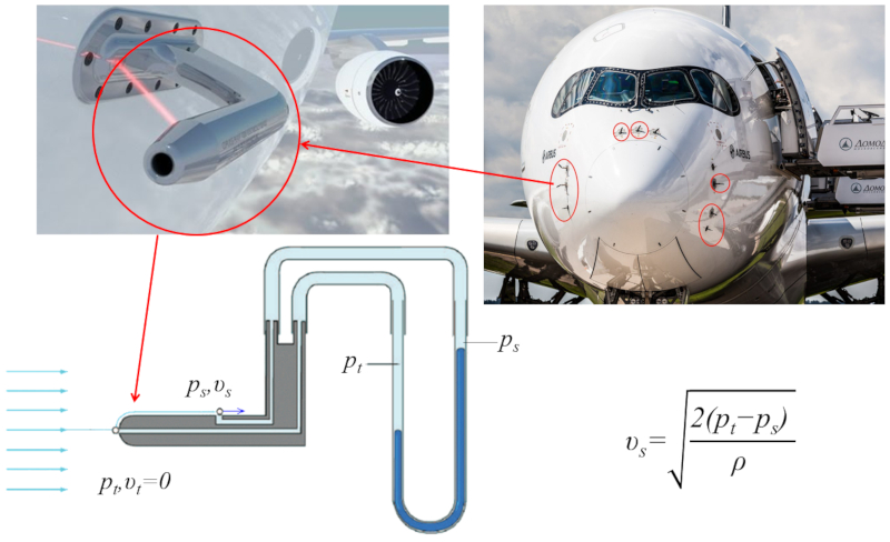 Los aviones determinan la velocidad utilizando el llamado tubo de Pitot. Este tubo consta de dos orificios, uno en el frente (borde de ataque) y el otro en uno de los lados. En el borde de ataque, la velocidad es nula, mientras que en el lateral se registra la velocidad a la que el avión avanza con respecto al medio. En las aberturas del tubo, se encuentran dos conductos que contienen un líquido para medir la diferencia de presión entre ambos puntos. Utilizando la ecuación de Bernoulli, es posible calcular la velocidad del avión a partir de la diferencia de presión y la densidad del líquido.