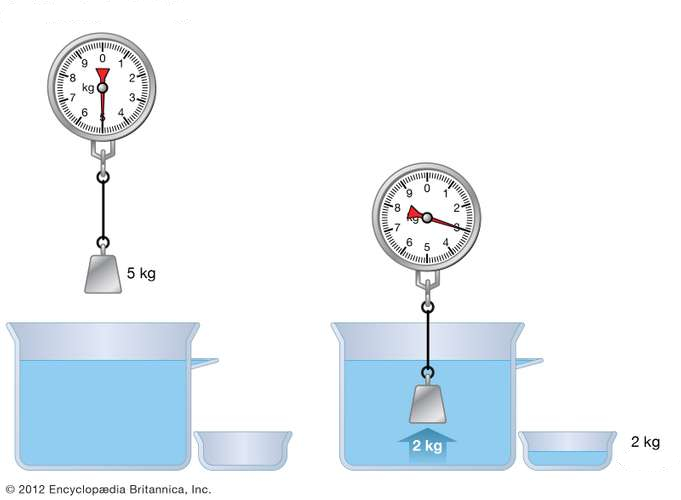 When an object hanging from a dynamometer is submerged in a liquid, it is observed that the force indicated by it decreases, indicating the existence of a buoyant force a buoyancy force ($F_b$) generated by the liquid.