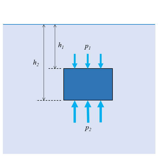 To explain the lift experienced by a submerged body, it is necessary to study the vertical pressures to which it is exposed. Since the bottom face of the body is at a greater depth than the top face, the pressure at the bottom is greater than at the top, resulting in a net upward force that generates the observed lift. This phenomenon is similar when a body floats on the surface, where there is no water pressure on it; again, it is the pressure at the bottom that generates lift.