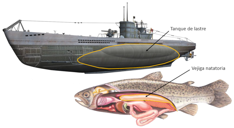 Submarines and fish have the ability to adjust the depth at which they remain in the water. They can ascend to the surface (float) or descend, limited only by the pressure they can withstand. They achieve this by using ballast tanks (in submarines) and swim bladders (in fish), which are spaces where air can expand, occupying a greater volume of displaced water.