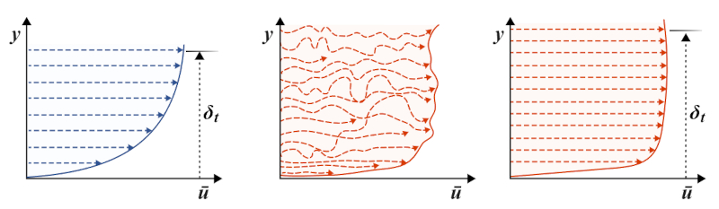 The first consequence of this is that fluid parameters tend to mix, causing the disappearance of velocity differences and the emergence of a type of mean velocity. When averaging the motion, structured patterns emerge, but they no longer originate from individual fluid elements but rather from a temporal mixture. As a result, a relatively constant profile similar to the profiles defined in laminar flow emerges, but in this case, these are mean values with fewer large gradients, making them more uniform.