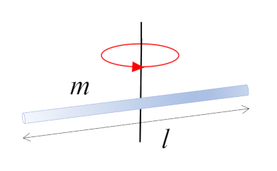 Ein Balken mit Masse $m$ und Länge $l$, der um sein Zentrum rotiert, das mit dem Schwerpunkt übereinstimmt: