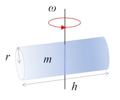 In dieser Situation rotiert ein Zylinder mit Masse $m$, Radius $r$ und H he $h$ um eine Achse, die senkrecht zu seiner eigenen Achse verl uft. Diese Achse verl uft durch den Mittelpunkt der L nge des Zylinders, wo sich der Schwerpunkt (CM) befindet: