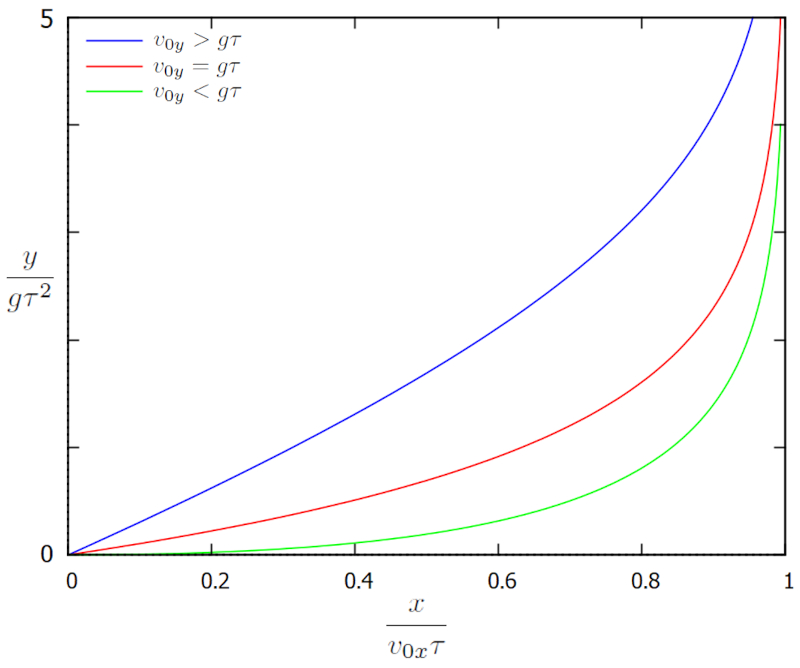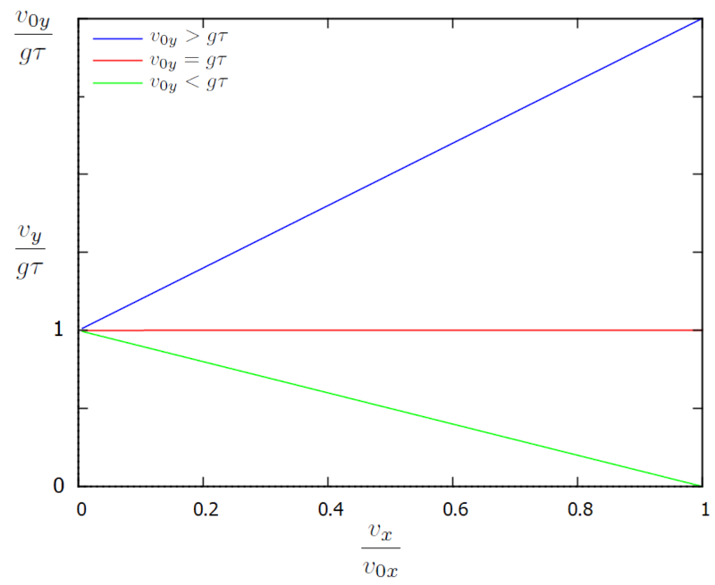 Le diagramme montre comment les deux composantes de la vitesse voluent dans le temps. Initialement, $v$ est gal $v_{0x}$, ce qui correspond un point sur le bord droit du graphique. Au fil du temps, les composantes de la vitesse voluent de la droite vers le bord gauche, o la vitesse horizontale est nulle et la vitesse verticale atteint la limite de $g\tau$, de sorte que $v/g\tau$ est gal un.