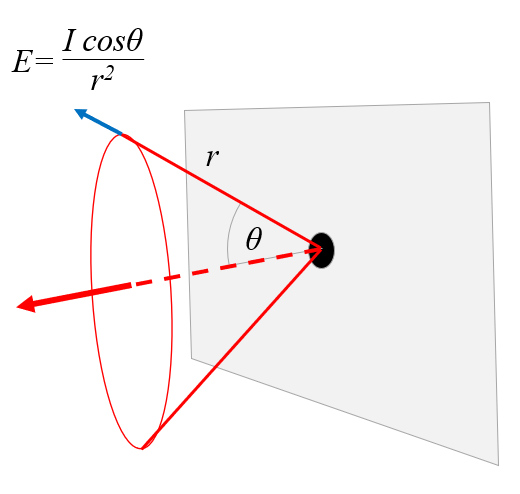 | $I(r,\theta)=\displaystyle\frac{r_0^2}{r^2}I_0\cos\theta$ |