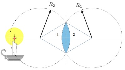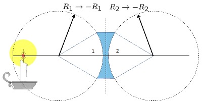 | $\displaystyle\frac{1}{ f_{vcs} }=( n -1)\left(\displaystyle\frac{1}{ R_1 }-\displaystyle\frac{1}{ R_2 }+\displaystyle\frac{( n -1) d }{ n R_1 R_2 }\right)$ |