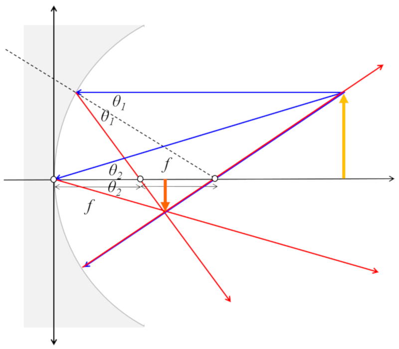 In the case of a concave mirror, the angle of incidence and reflection are determined based on a line that goes from the point of impact and a point that is two focus distances from the lens. A special case is a beam that comes parallel to the optical axis that is reflected through the focus. Vice versa if it passes through the focus it is reflected parallel to the optical axis. The latter is used in car lights.